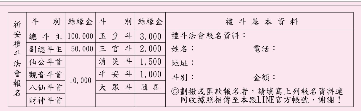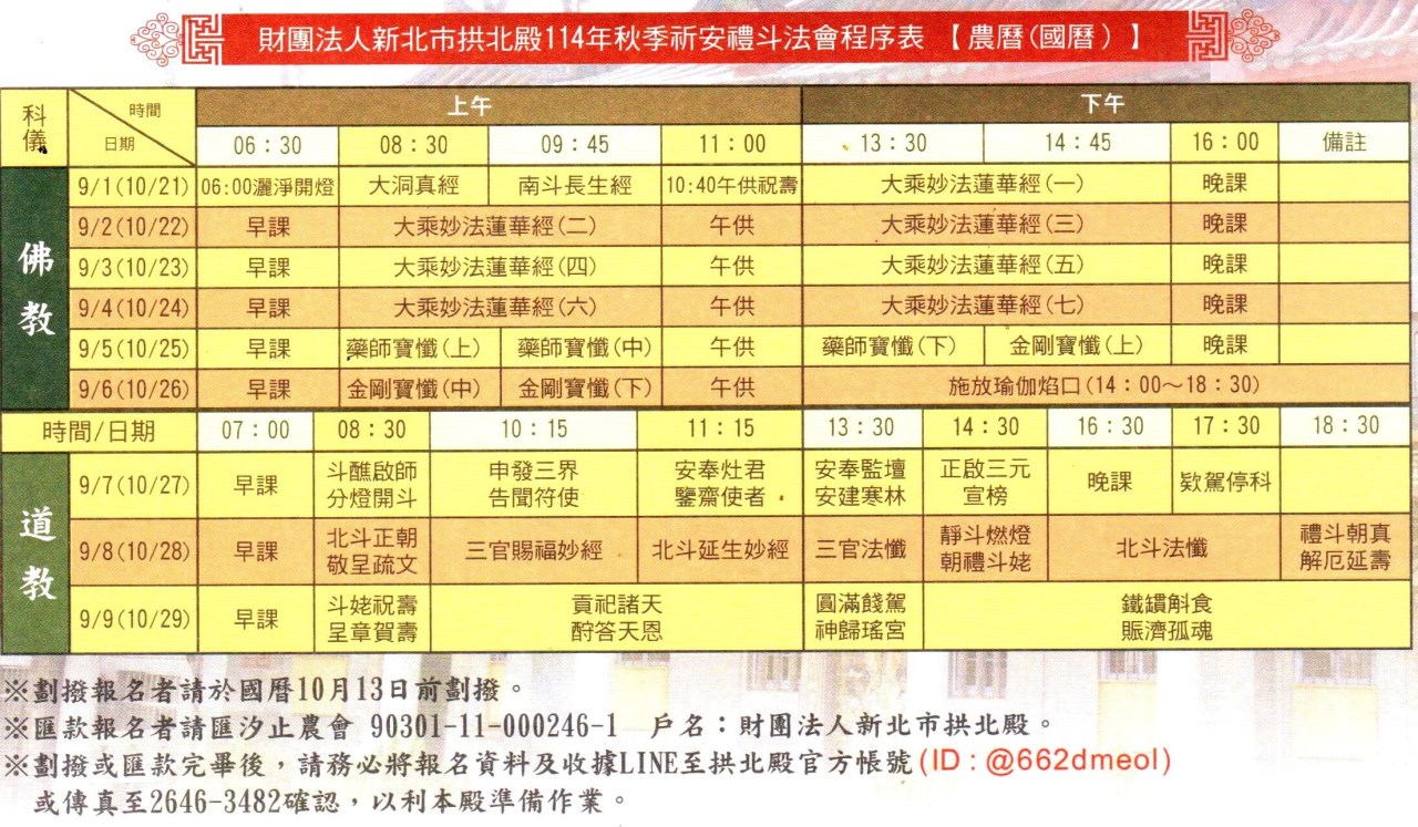 法會日期自農曆九月一日至九日(國曆10月21日至10月29日)止,敬請善信大德提早報名登疏禮斗,並撥冗蒞殿參拜 同霑法益 共沐神庥。