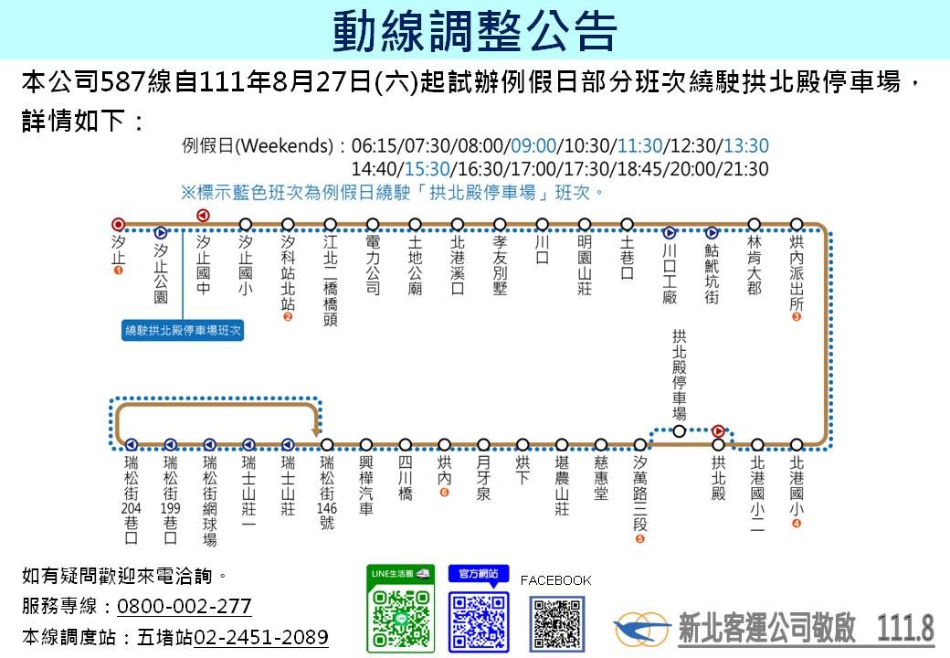 好消息!自111年8月13日起每逢例假日,587公車有4個班次從汐止火車站繞駛本殿停車場,班次如下:09:00、11:30、13:30、15:30。 請諸大德善加利用塔乘。